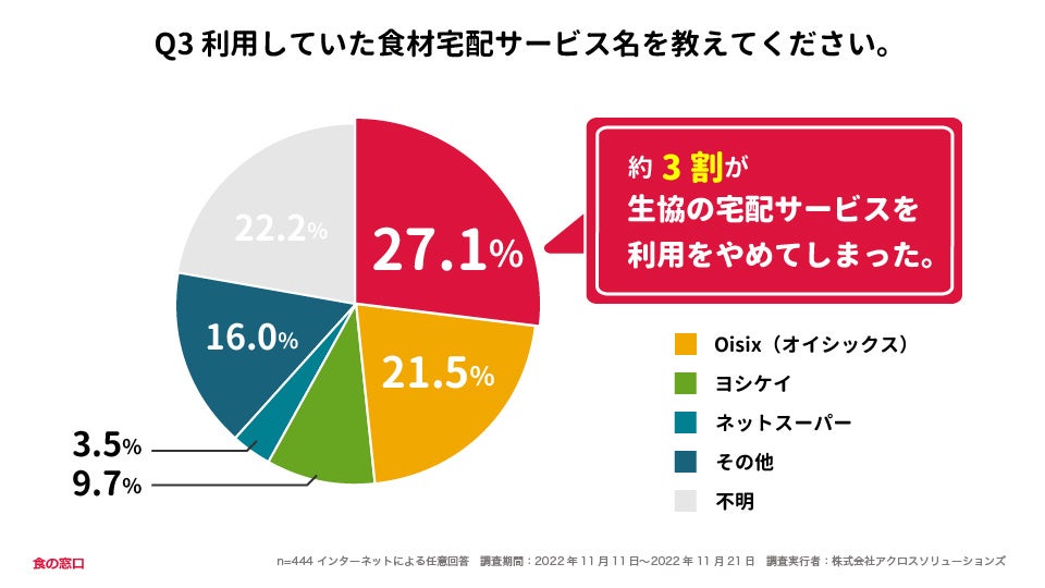利用をしていたがやめてしまったというサービスで回答が多かったのは「生協(各地域のコープ、パルシステムなど)」27.1%、「oisix(オイシックス)」21.5%でした。