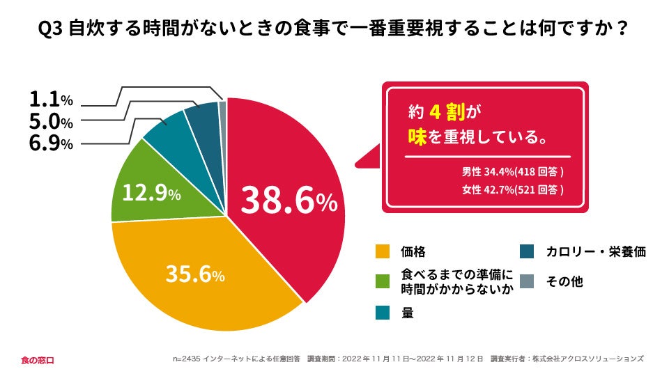 自炊をする時間がないときの食事で「味」を一番重要視している人が多く38.6%でした。