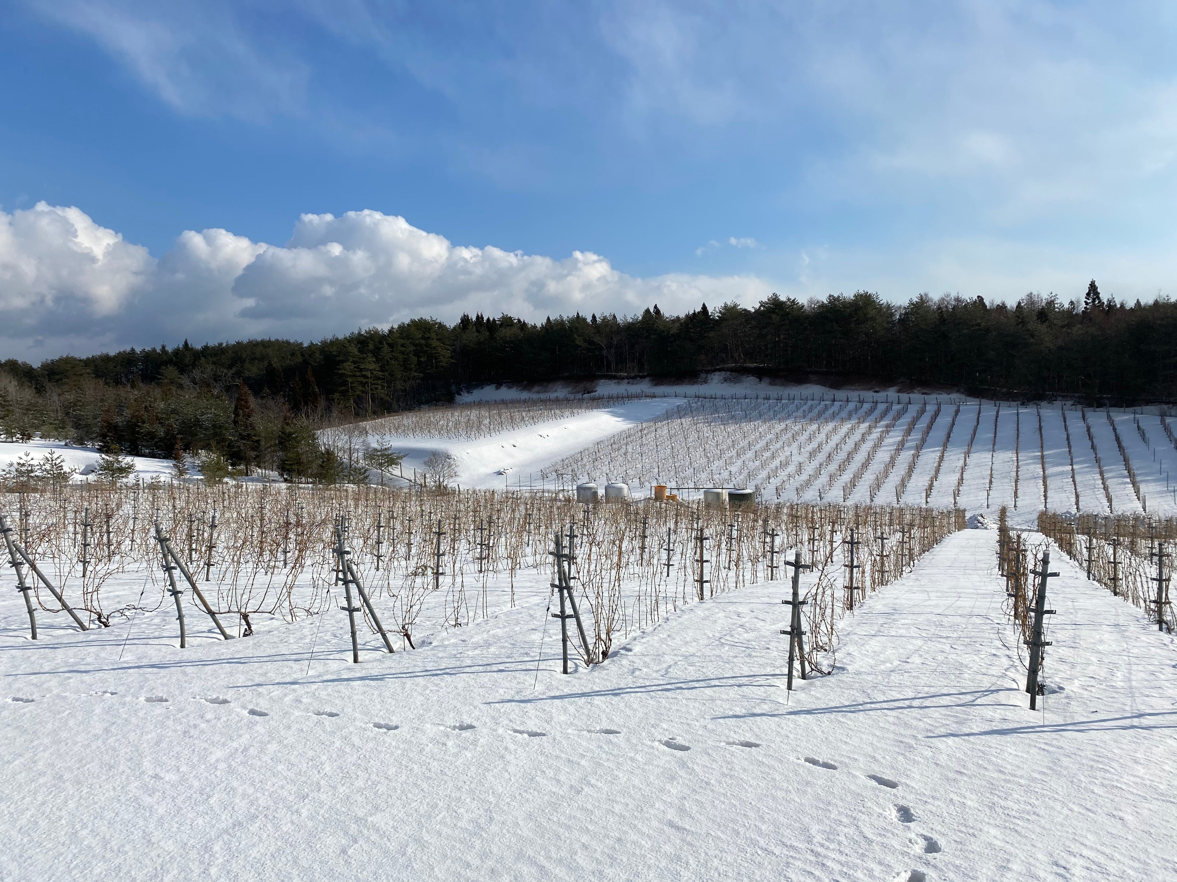 例年よりも寒さが厳しく、昨年度末から1月は豪雪となり、枝が半分隠れるほどの積雪となりました。剪定進捗状況が不安ではありましたが、作業効率の悪化と作業者の安全性を考え、1月中旬から2月中旬まで剪定作業を中止しました。1か月後、作業を再開させ、ぶどうの目覚め前に作業を完了することができました。