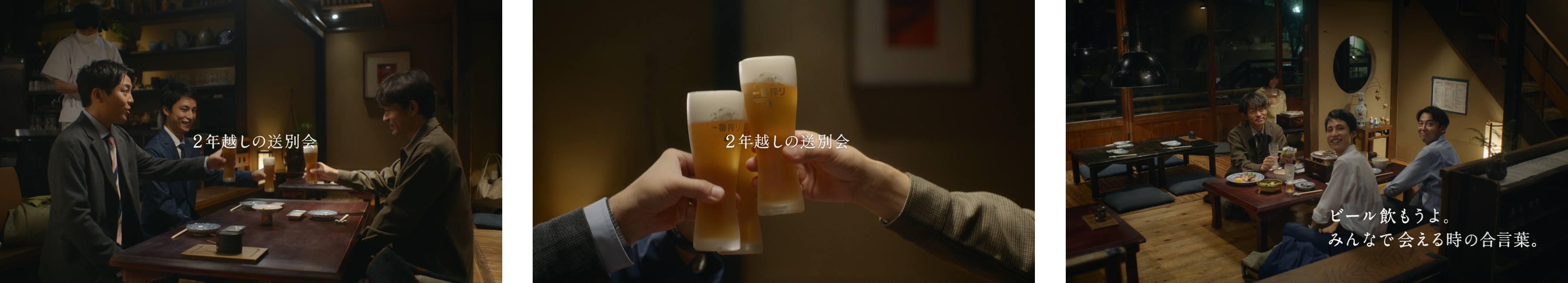 2年越しで実現した送別会に参加できたのは、わずか3人。しかし「2年も経って2人も集まったの、すごくないですか?」と、同じ職場で苦楽を共にした3人は、幸せな気持ちに浸りながら「一番搾り」で乾杯します。