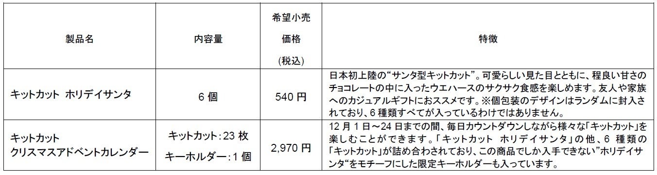 当ショップでは、“サンタ型キットカット”「キットカット ホリデイサンタ」と、12月1日~24日まで毎日カウントダウンしながら様々な「キットカット」を楽しめる「キットカット クリスマスアドベントカレンダー」の2商品を販売します。