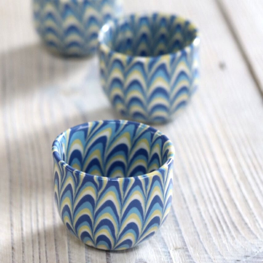 絵付けとは異なり、金太郎飴のように大きな塊を作ってから成形しているため内外・表裏とも同じ模様が表出するのが特徴の器です。