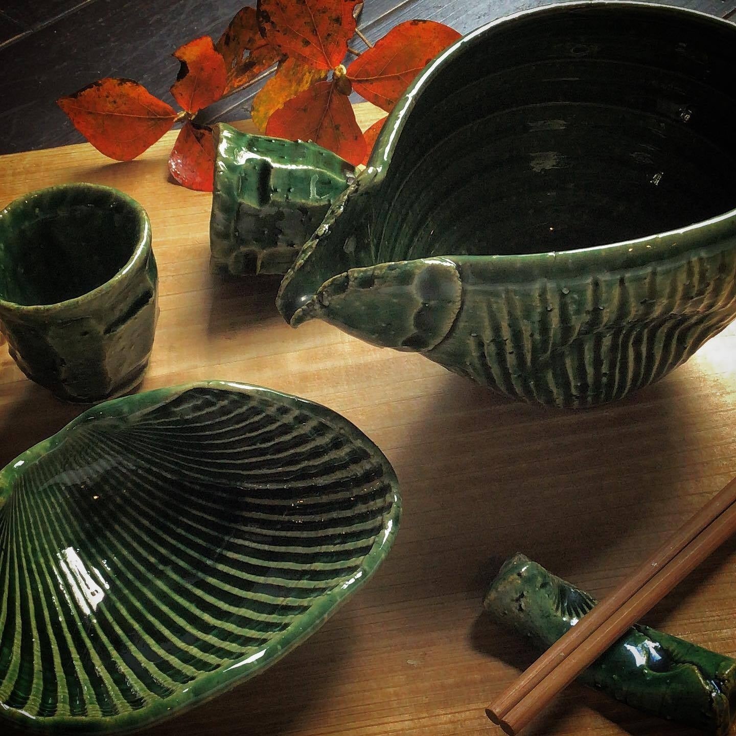 今回のポップアップでは、燗酒用のかずらの取っ手付きの方口など、深みのある緑色が美しい織部の酒器を中心に展開します。