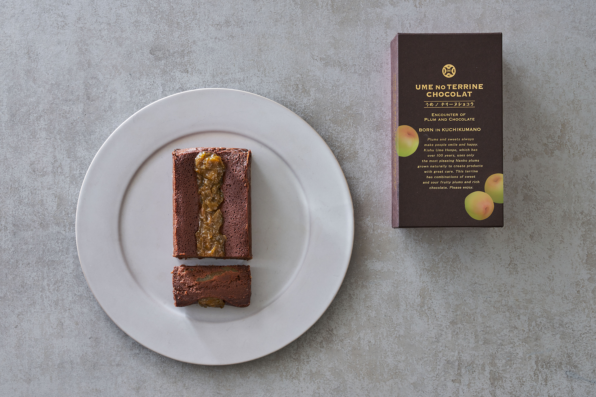 「うめノ テリーヌショコラ」は「梅の美味しさをもっと多くの人に届けたい!」という想いから、スイーツ作りが始まりました。数十を超える試作品の中で、職人がひとつひとつ丁寧に漬け込んだ芳醇な紀州南高梅をチョコレートテリーヌにふんだんに使用し「爽やかな香りとほろ苦い甘味」を愉しむことができる「うめノ テリーヌショコラ」が完成しました。しっとりとしたチョコレートテリーヌに、肉厚な梅の食感、香りと苦味のマリアージュ、最後にほのかにコーヒーの香りをまとわせることで、大人のスイーツに仕上げました。