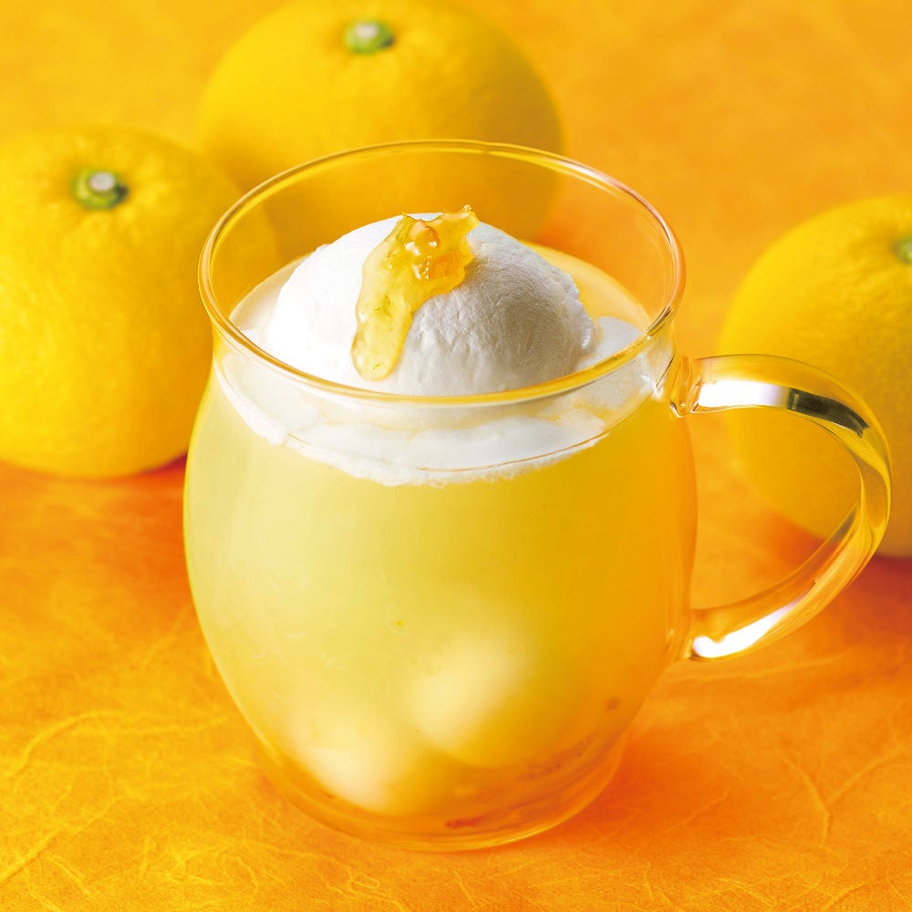 「柚子のくず湯~白玉入り~」は、柚子の果肉が入った、ほんのり生姜が香るとろ~りなめらかなくず湯に、白玉を入れました。ホイップクリームを混ぜるとクリーミーでまろやかな味わいに。