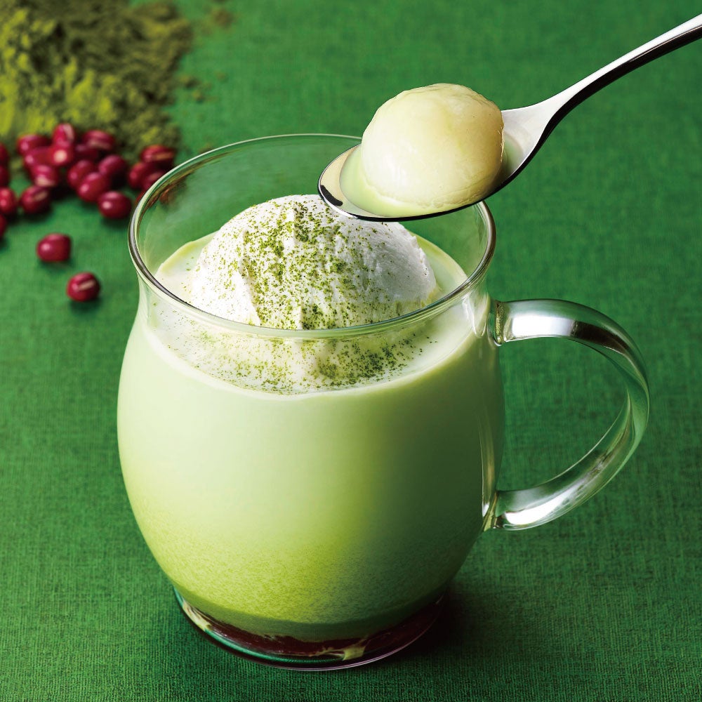 「あんこ抹茶オレ~白玉入り~」は、カップの底に北海道産のこしあんを入れ、やさしい味わいの抹茶オレを注ぎ、白玉を入れておしるこ風に仕立てました。混ぜながら飲むと奥深く上品な味わいをお楽しみいただけます。