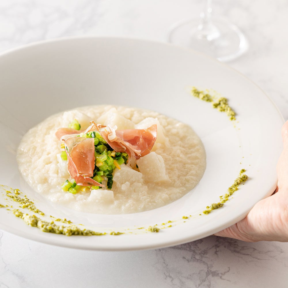 ブイヨンベースのリゾットに、とろとろで甘く優しい味わいの蕪、生ハムの塩気、そしてゆずがふんわりと香ります。添えた蕪の葉の浅漬けやぴりっとした柚子胡椒をお好みで加えながらお楽しみください。