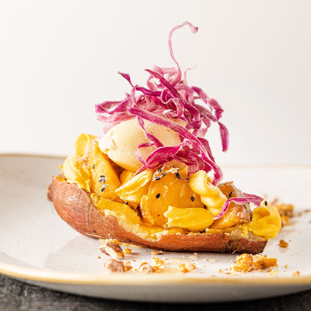 さつまいもほぼ丸ごと1本を使い、まるでさつまいもパフェ!?な一品が出来上がりました。低温でじっくりと焼き上げた蜜芋を半分に割り、片方はくり抜いてカスタードブリュレの器に、もう片方は焦がしバターでキャラメリゼし甘味をぎゅっと閉じ込めた大学芋風に仕立て、くり抜いたさつまいもで作るさつまいもピューレとともに、その器の上に重ねました。焦がした蜂蜜にホワイトバルサミコを合わせたソースが甘酸っぱく、最後まで食べ飽きさせません。