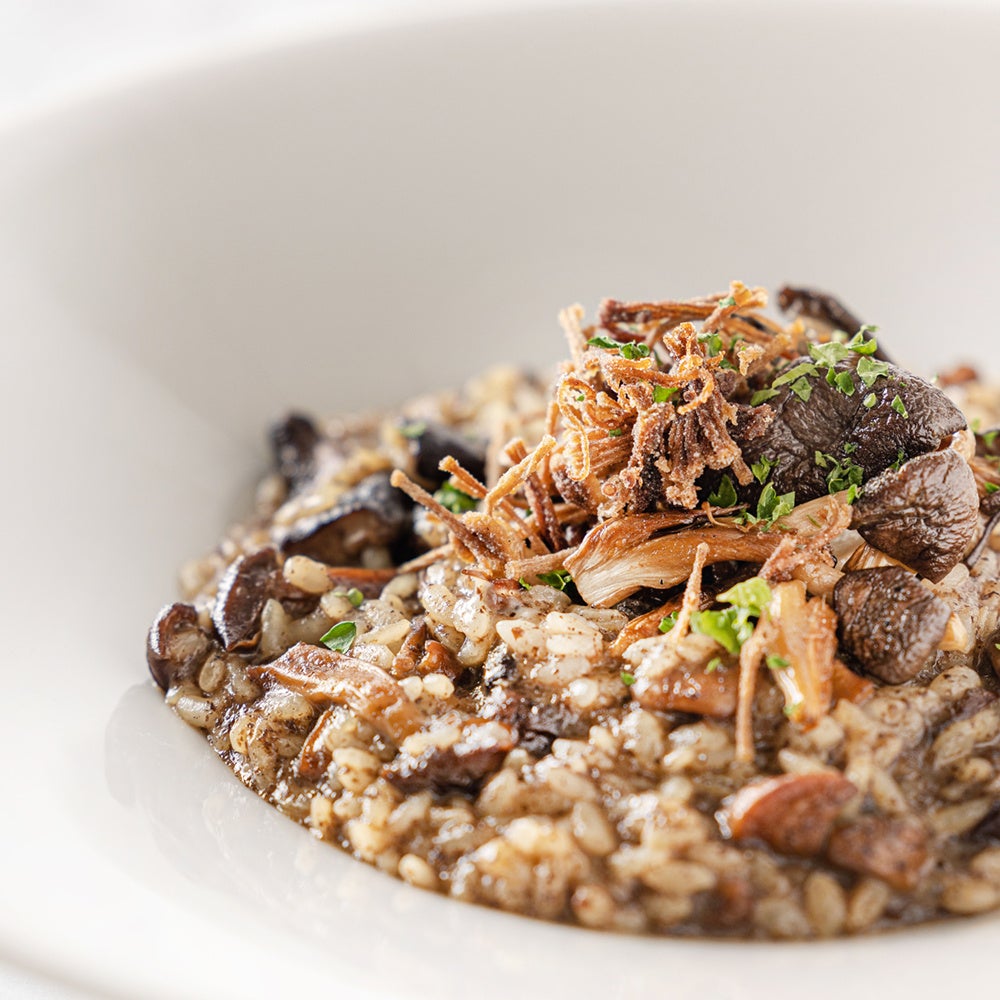 コーヒー豆かすの菌床から栽培されたひらたけを使ったリゾット。ひらたけの強い味わいと香りをお楽しみいただけるよう、ひらたけと米をしっかりと炒め香りを移した後、ブイヨンでじっくりと炊き上げました。しめじとえのきのフリットを添えたきのこづくしの一品です。