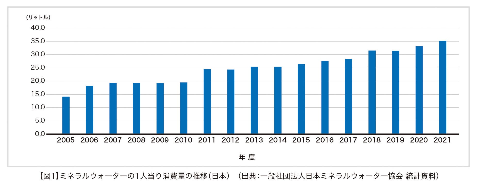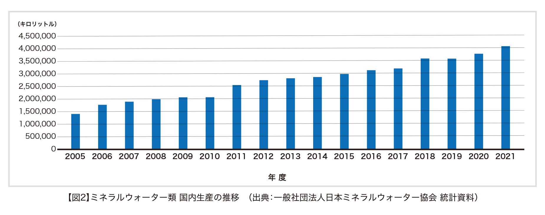 今回、コロナ禍で低迷していたと言われる飲料市場においても、伸長を続けていた「水」に注目。一般社団法人日本ミネラルウォーター協会が発表したミネラルウォーターの1人当り消費量の推移【図1】によると、ミネラルウォーターの消費量は2005年から2021年にかけて約2.5倍となっている。これに伴い、ミネラルウォーター類の国内生産量【図2】も増加傾向であった。多くの人が水を買う時代、その味わいを決める要素は何なのか。水は紅茶やダシの味わいにどれだけ影響をしているのか、分析・検証した。