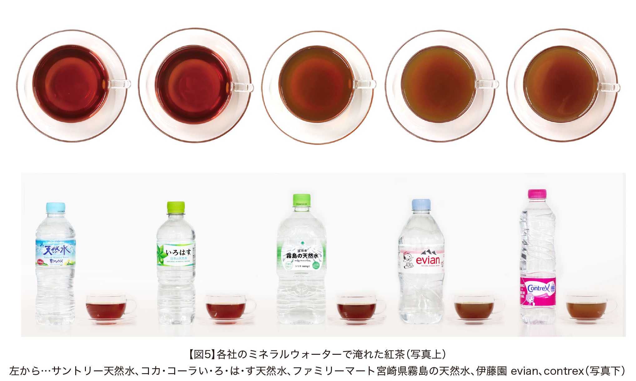 次に、茶葉や抽出方法は変えずに、水だけを変えて紅茶を淹れた場合、味や見た目にどのような違いがあるか。ミネラル感の違いに着目し、軟水・中硬水・硬水の代表的な5商品をピックアップし、検証した。