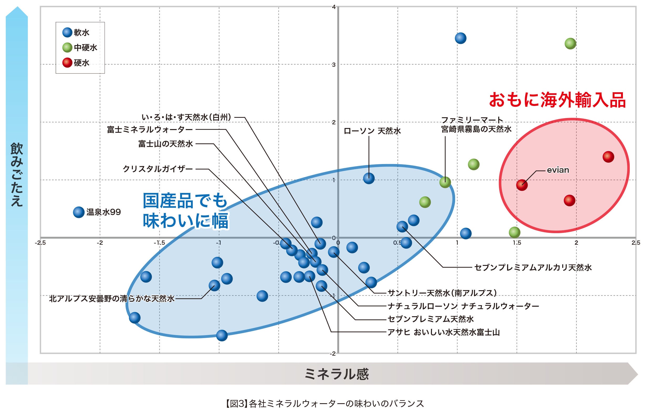【図3】にミネラルウォーターの「飲みごたえ」と「ミネラル感」のバランスを示した。ゼロ点はミネラルウォーター39品の平均値。