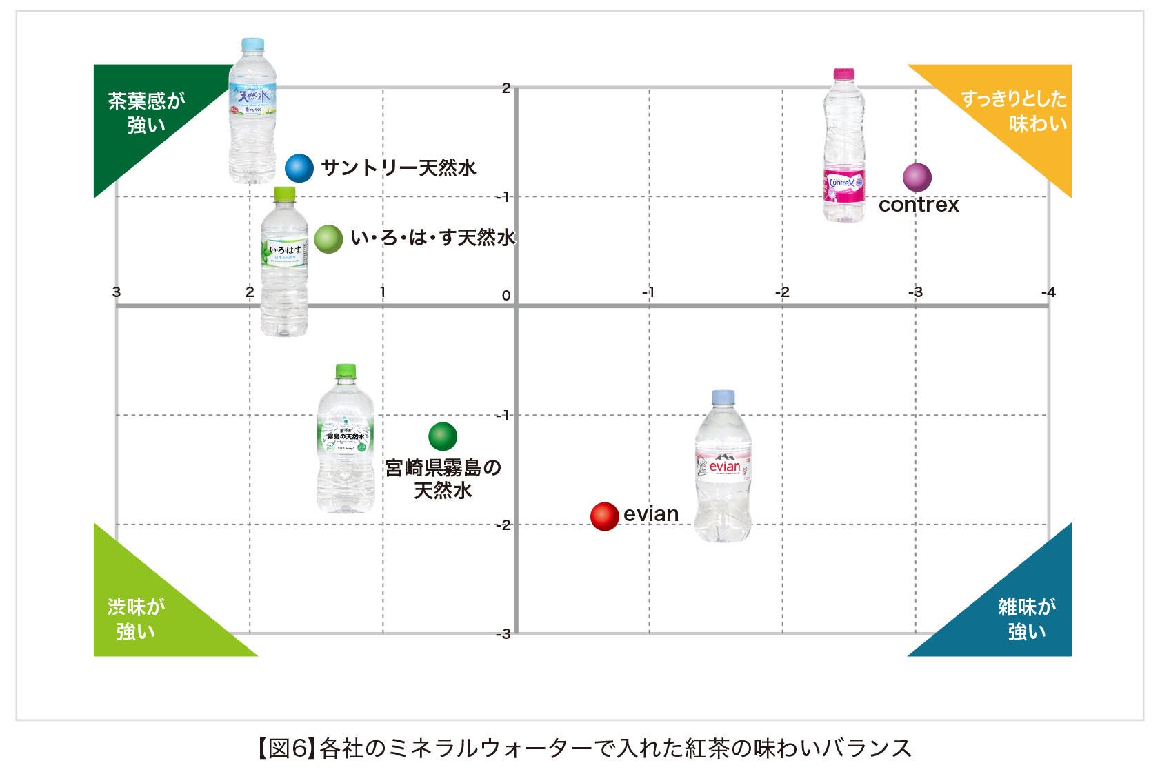本分析で注目したいのは、国内産でも飲みごたえとミネラル感には幅があるという点である。例えば「ファミリー マート宮崎県霧島の天然水」は国内産でも右上に位置する商品である。また「富士」「富士山」とうたった商品は近い距離に位置する商品が多く、似通った味わいだと考えられた。以上のことからも、水の味わいは産地、いわゆる「水源」がその性質に大きく影響を与えていると推測され、分析の結果からも、味わいに幅があることが示唆された。
