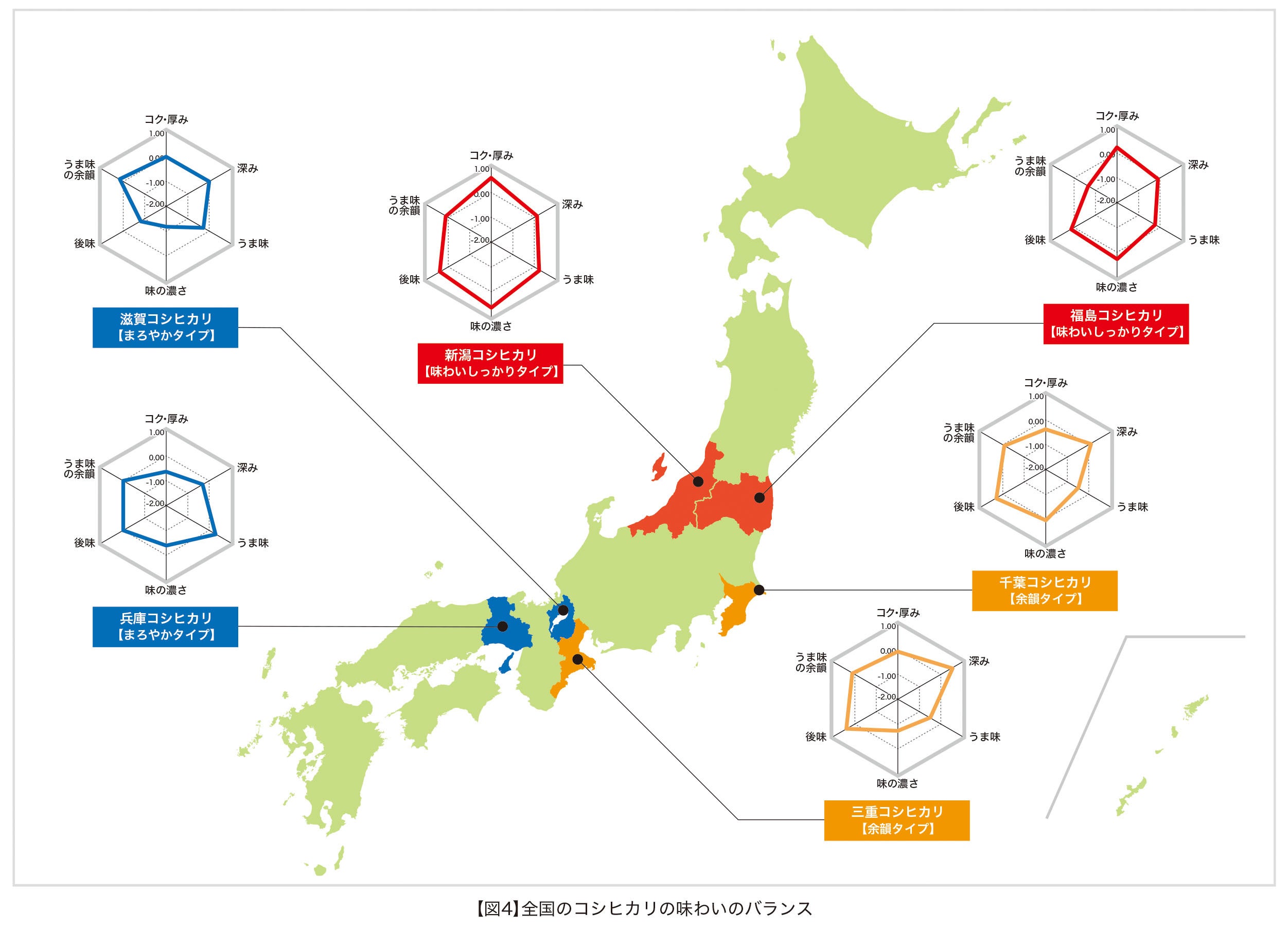 今回分析したコシヒカリは、大きく3つの味タイプに分類され、大まかに地方ごとの特徴が見出される結果となっ た。赤色グラフは味わいしっかりタイプ。「コク・厚み」「味の濃さ」「後味」が特徴的で、全体的なグラフのバランスも大きいことから、米らしさをしっかりと感じられる味わいであった。このようなタイプの米は、日本穀物検定協会による特Aランク米など、ランク上位品であることが多い。黄色グラフは余韻タイプであり「深み」「後味」が強く、味わいの余韻が広がる。青色グラフはまろやかタイプ。「うま味」や「余韻」が特徴的な味わいだと考えられる。銘柄に注目が集まりやすい米だが、同じ銘柄であっても味わいは異なり、そのタイプは地方ごとに大別される。米の味わいを決める要素はひとつではないが、水源や土壌、気候などが大きく影響し、それらが産地ごとの特徴となって表れているものと考えられる。