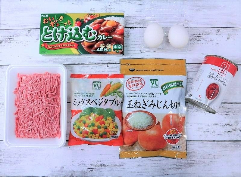 おいしさギューッととけ込むカレー、ゆでたまご、豚ひき肉、VLミックスベジタブル(冷凍)、VL玉ねぎみじん切り(冷凍)、完熟カットトマト