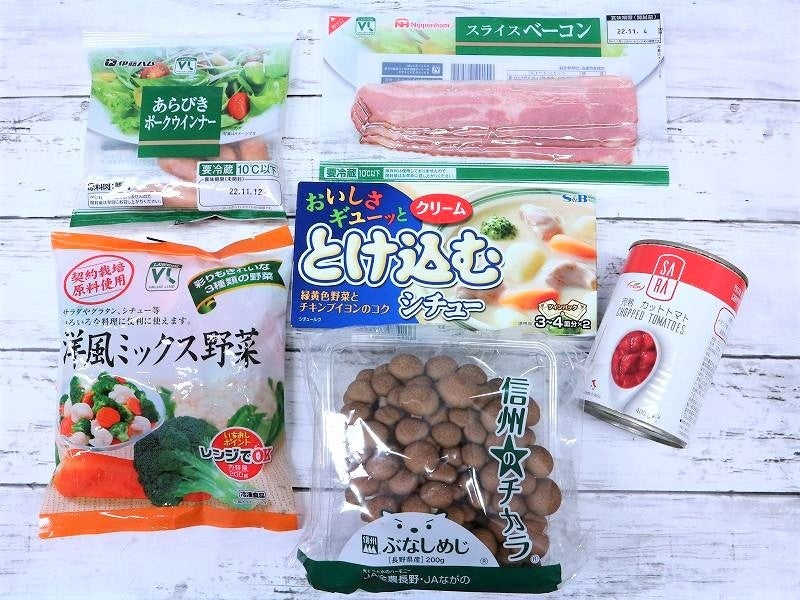 VLあらびきポークウインナー、VLスライスベーコン、VL洋風ミックス野菜(冷凍)、おいしさギューッととけ込むシチュークリーム、ぶなしめじ、完熟カットトマト