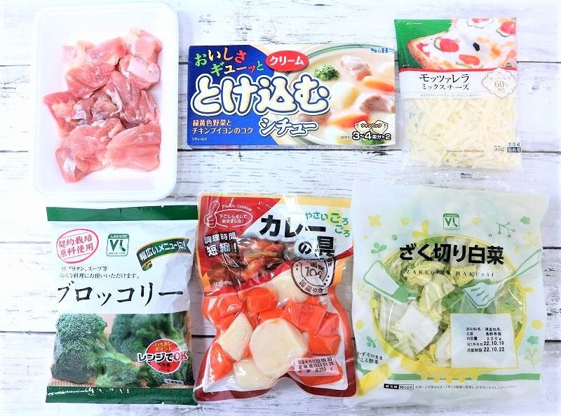 若どりもも肉角切り、おいしさギューッととけ込むシチュークリーム、モッツァレラミックスチーズ、VLブロッコリー(冷凍)、カレーの具、VLざく切り白菜