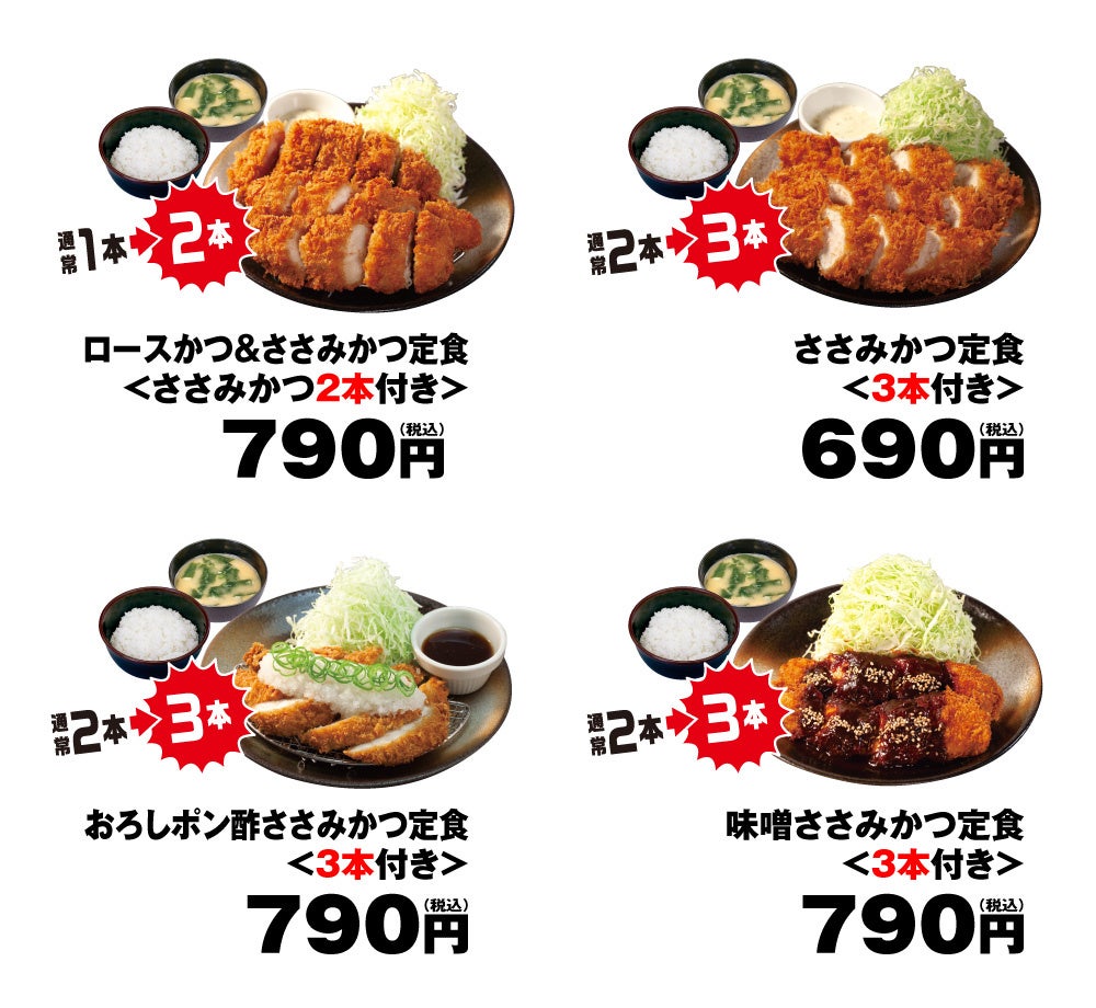 | 商品名 ロースかつ&ささみかつ定食(1本→2本) 790円 ささみかつ定食(2本→3本) 690円 おろしポン酢ささみかつ定食(2本→3本) 790円 味噌ささみかつ定食(2本→3本) 790円 ※お持ち帰りいただけます。お持ち帰りのみそ汁は、別途60円でお買い求めいただけます。 ※全て税込価格です。また、店内・お持ち帰りの税込価格は同一です。 ※本キャンペーン期間中の「ロースかつ&ささみかつ1本定食」の販売はいたしません。 ※本キャンペーン期間中は「たっぷりささみかつ定食」を690円で販売いたします。 開催期間 2022年11月30日(水)午後3時~2022年12月7日(水)午後3時 |