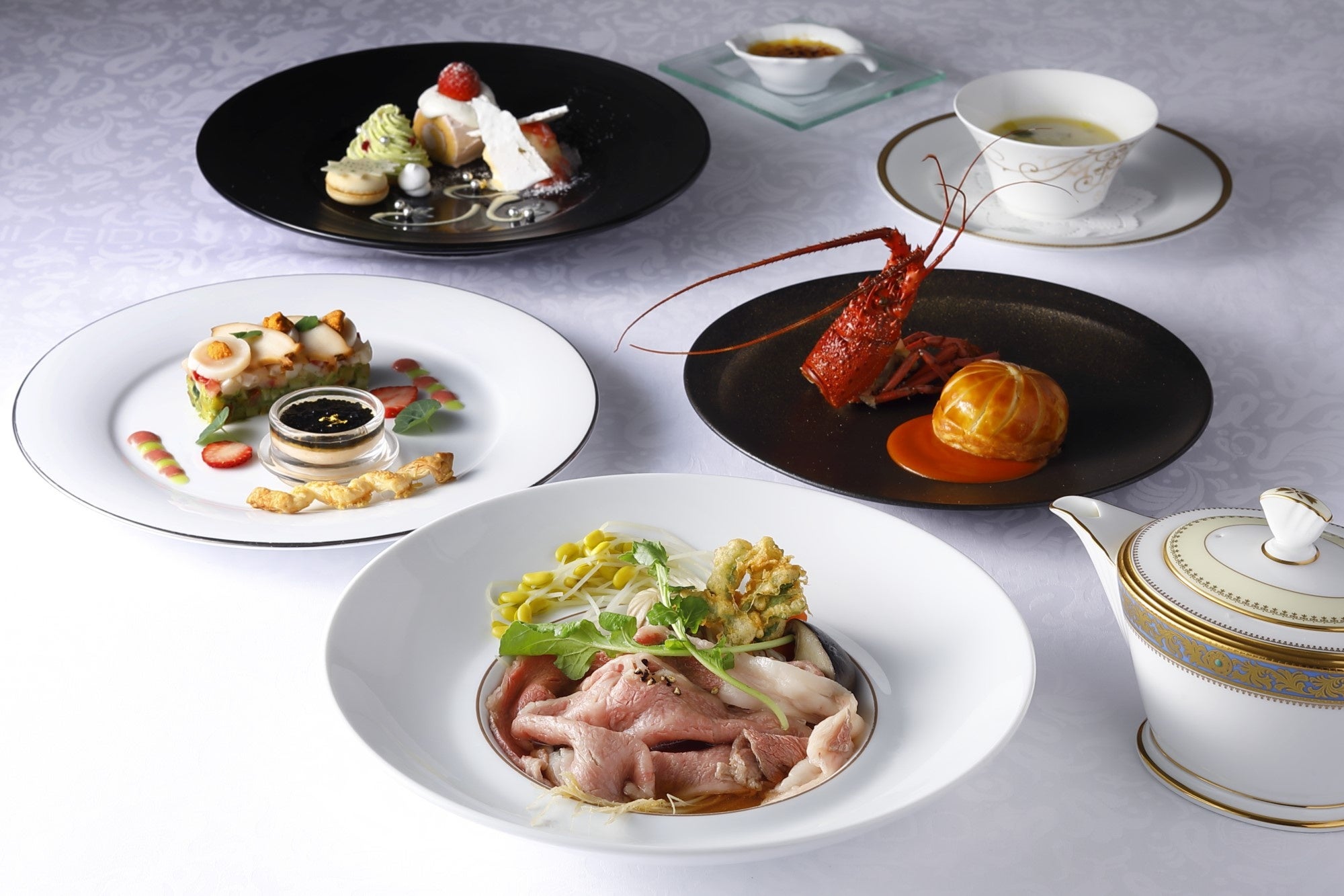 前菜は海の幸あふれる食材のミルフィーユに国産キャビアが乗ったババロアがアクセント。スープで心も身体も温まり、魚料理で舌平目と伊勢海老をご堪能。メインの肉料理では和牛サーロインを濃厚なコンソメスープに浸してお召し上がりいただきます。アミューズからデザートまでこころゆくまでごゆっくりとお楽しみください。