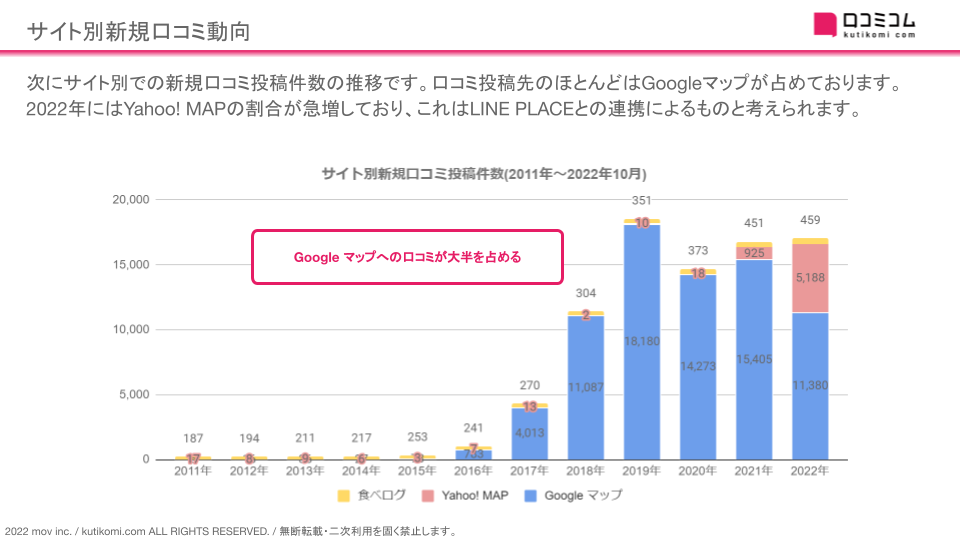 次にサイト別での新規口コミ投稿件数の推移です。口コミ投稿先のほとんどはGoogleマップが占めております。2022年にはYahoo! MAPの割合が急増しており、これはLINE PLACEとの連携によるものと考えられます。
