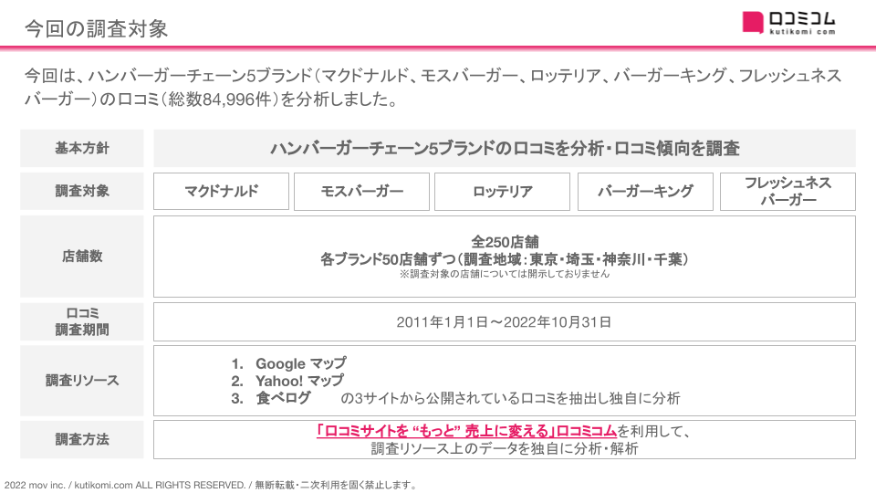 今回は、ハンバーガーチェーン5ブランド(マクドナルド・モスバーガー・ロッテリア・バーガーキング・フレッシュネスバーガー)に寄せられた約8万5000件の口コミを調査し、5ブランドの比較検証を行いました。