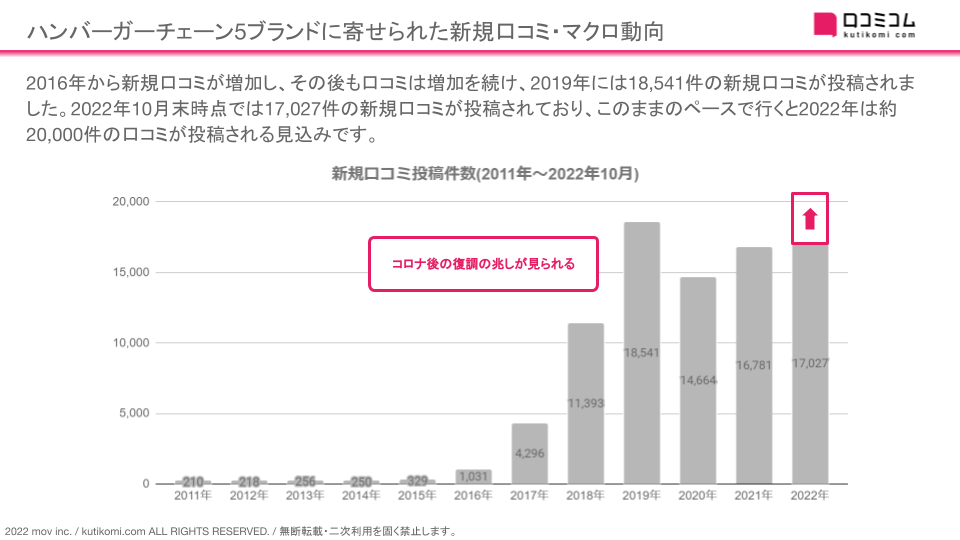 2016年から新規口コミが増加し、その後も口コミは増加を続け、2019年には18,541件の新規口コミが投稿されました。2022年10月末時点では17,027件の新規口コミが投稿されており、このままのペースで行くと2022年は約20,000件の口コミが投稿される見込みです。