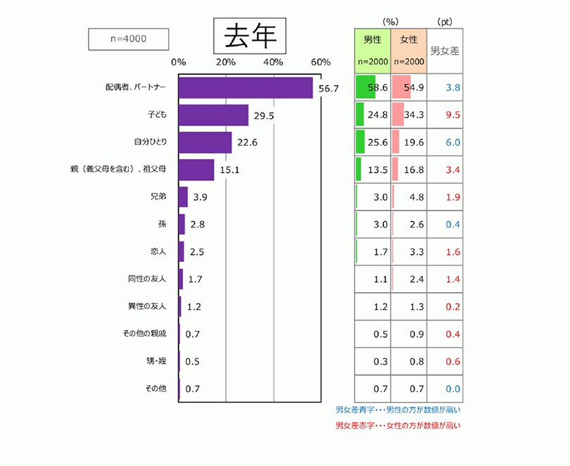 今年一緒に過ごす人は「配偶者、パートナー」(57.4%)、「子ども」(29.1%)、「自分ひとり」(22.6%)、「親(義父母を含む)、祖父母」(14.9%)の順です。「同性の友人」(1.9%)、「異性の友人」(1.2%)と、友人と過ごす人はかなり少ないようです。