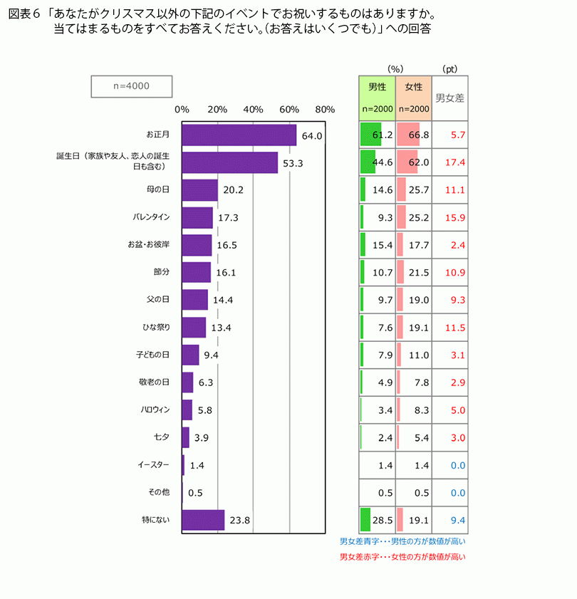 「クリスマス以外の下記のイベントでお祝いするものはありますか」(図表6)と聞くと、「お正月」(64.0%)と「誕生日(家族や友人、恋人の誕生日も含む)」(53.3%)の2項目は半数を超えました。