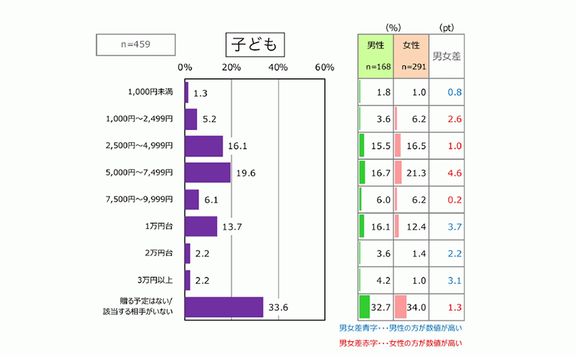一方、「子ども」(図表5右)相手だと、「贈る予定はない」という人は33.6%で、「配偶者、パートナー」と比べるとプレゼントを贈る割合が高いようです。予算は「配偶者、パートナー」と比べれば低く、最も多いのが「5,000円~7,499円」(19.6%)、そのあとは「2,500円~4,999円」(16.1%)、「1万円台」(13.7%)と続きます。