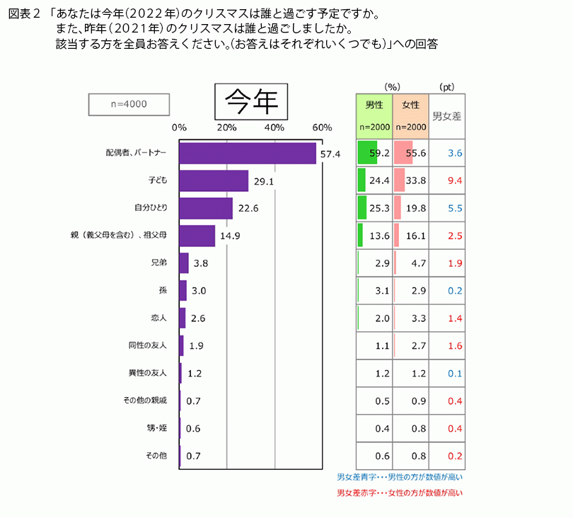 今年のクリスマスを誰と過ごす予定か、去年のクリスマスを誰と過ごしたかを合わせて聞きました(図表2)。