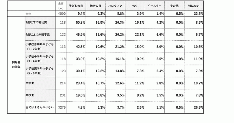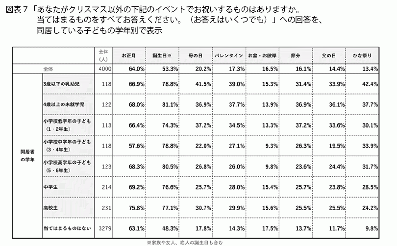 また、子どもと同居している人だと、ほぼすべてのイベントで全体平均よりも高くなっています(図表7)。イベントの盛り上がりは子どもの有無や同居しているかどうか、子どもの年齢にも大いに左右されるようです。