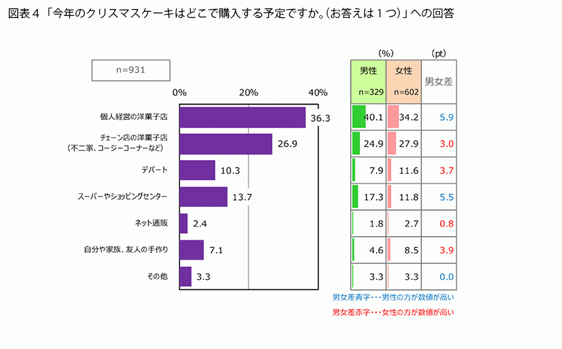 調査対象の4,000人のうち、クリスマスにケーキを買う予定の人が931人という結果でした。今年、ケーキをどこで買う予定かを聞いたところ(図表4)、最も割合が高かったのは「個人経営の洋菓子店」(36.3%)でした。