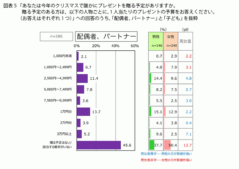 今回の調査では配偶者・パートナーがいる人が4,000人中2,626人でした。そのうち、今年のクリスマスに「プレゼントを贈る(自分へのプレゼントも含む)」と回答した人は386人いました。さらにそのなかで約半数の45.6%の人は配偶者やパートナーに「贈る予定はない」ということです。贈る予定の人に予算を聞くと、最も多かったのは「1万円台」の13.7%で、2位が「2,500円~4,999円」です。
