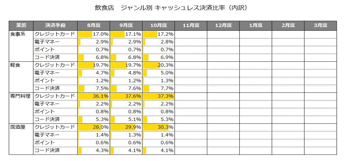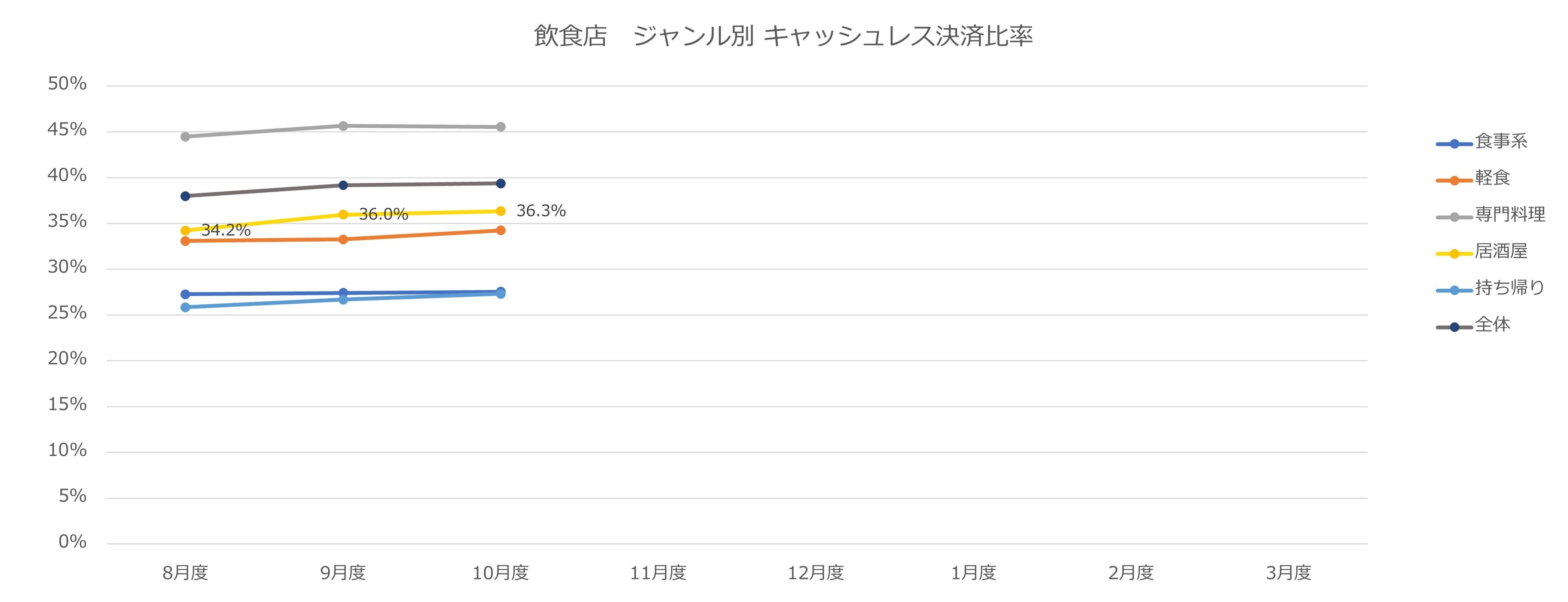 - 9月度→10月度で飲食店全ジャンルのキャッシュレス決済比率は101%と微増(39.2%→39.4%)。居酒屋で 微増している(36.0%→36.3%)。