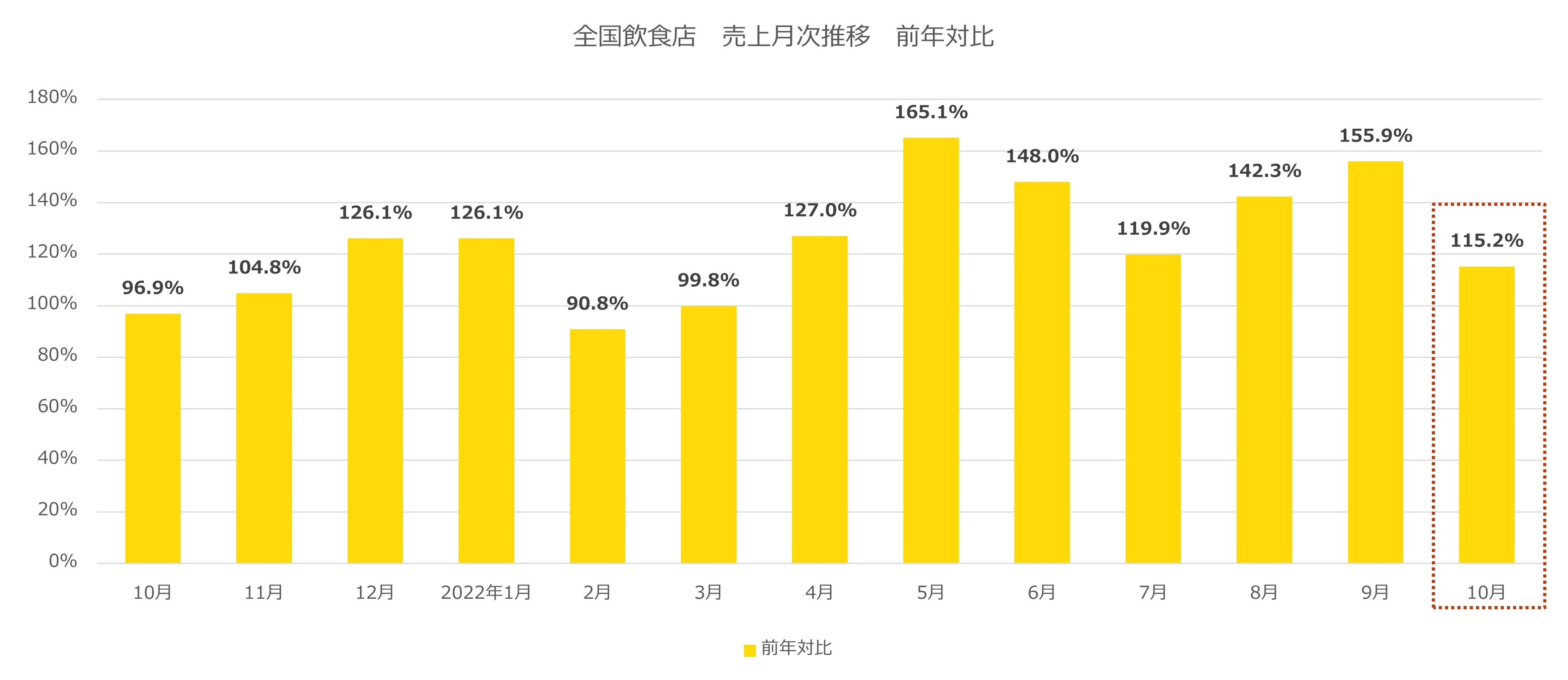 2021年10月の売り上げが2020年比96.9%、2020年10月の売り上げが2019年比115.1%(※グラフ表示外)なので、コロナ前(2019年)対比では128%の水準である。