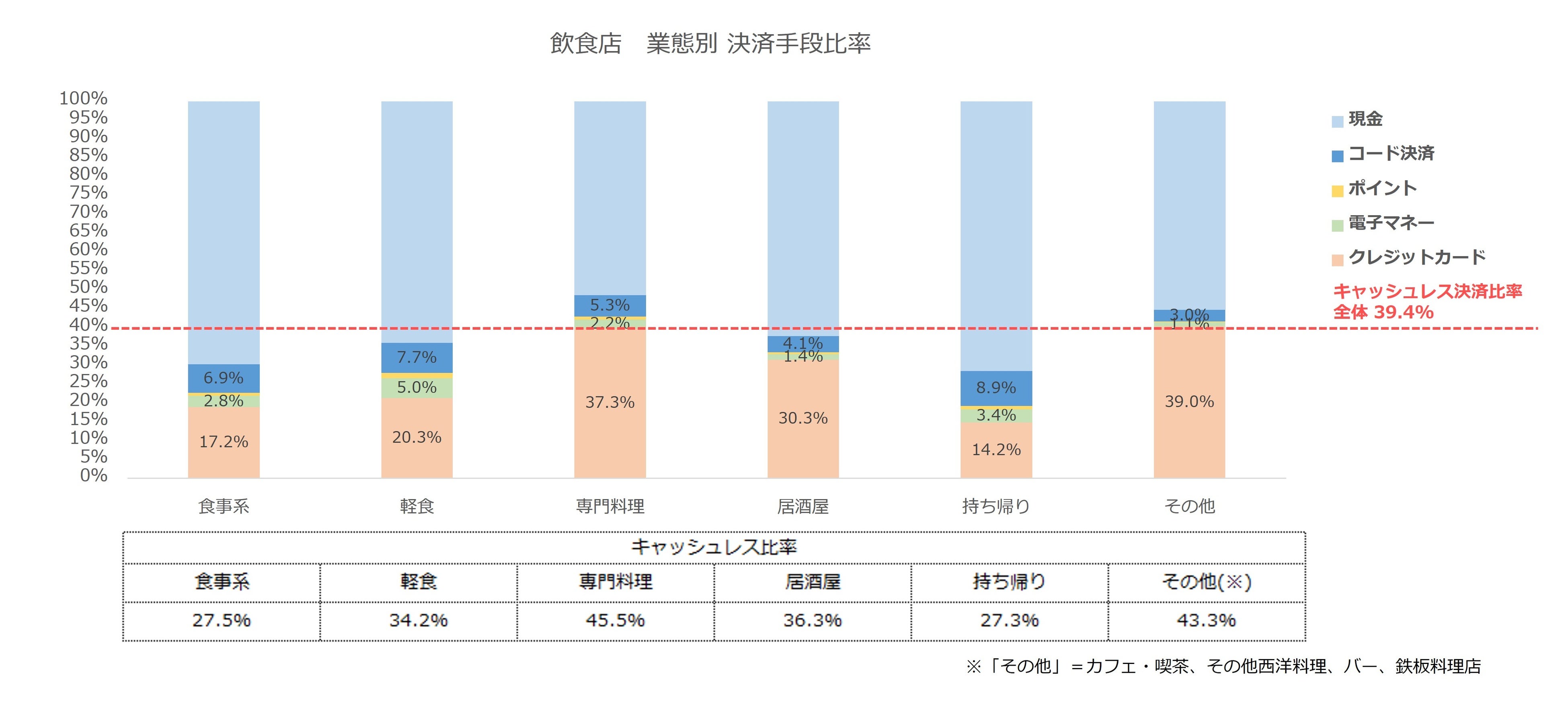 - 業態別に見ると、専門料理・その他でのキャッシュレス決済比率が高い。コード決済・電子マネーの使用比率は食事・軽食系・持ち帰り業態で高い。