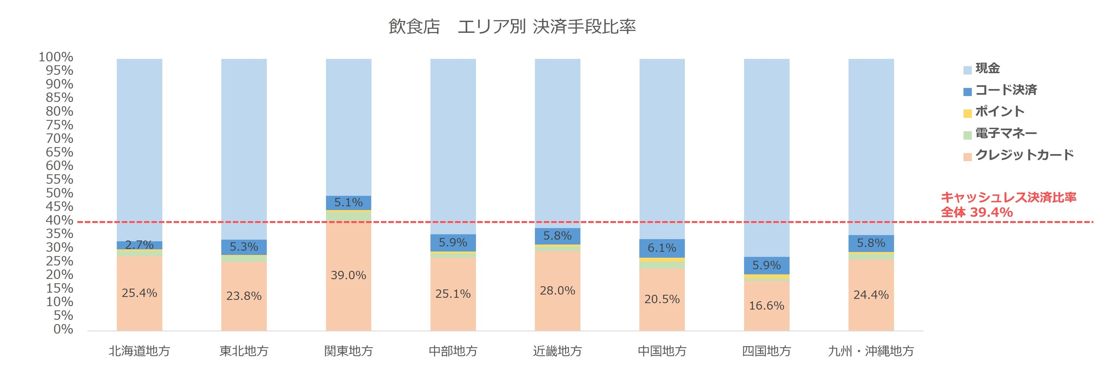 ・キャッシュレス決済比率は全国で39.4%。エリア別には関東地方が47.7%と最も高い。
