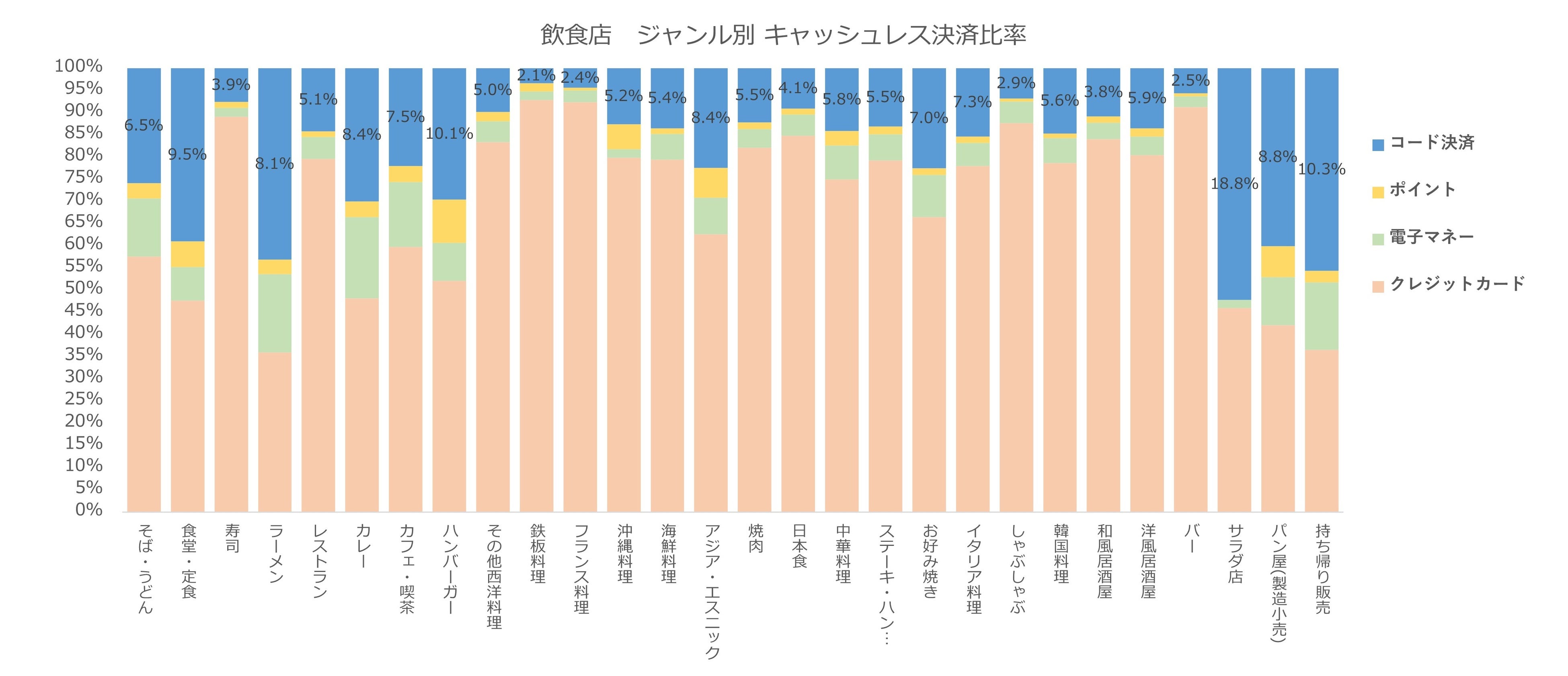 ハンバーガー・カレー・ラーメン・そば・うどん等の軽食/食事系は前頁の通り現金比率が高いものの、キャッシュレス決済の中ではコード決済比率が高い。