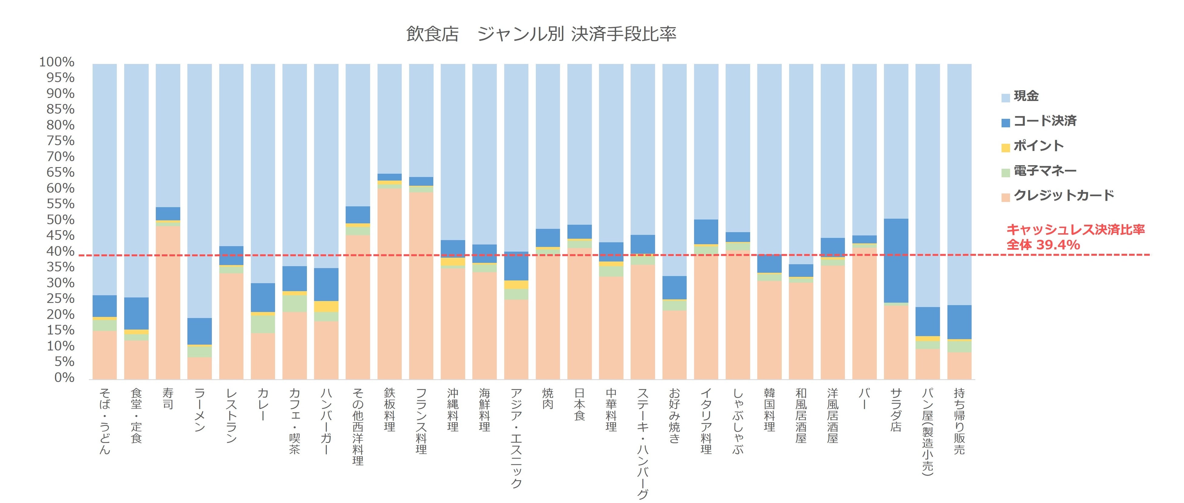 集計内容:飲食店 ジャンル別 キャッシュレス決済方法比率、キャッシュレス決済比率(内訳)