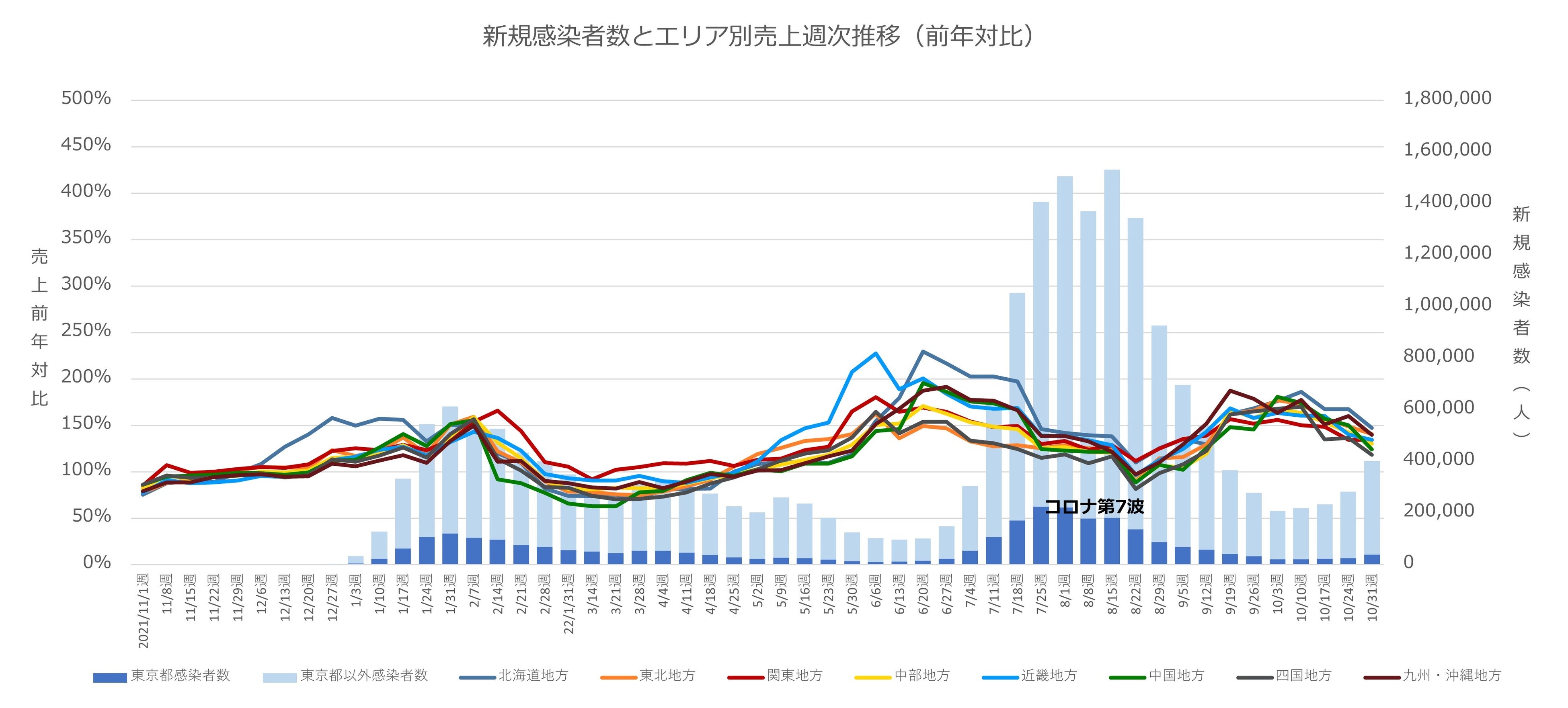 - 集計1:全国飲食店 売上月次推移(前年対比)、新規感染者数とエリア別売上週次推移(前年対比)