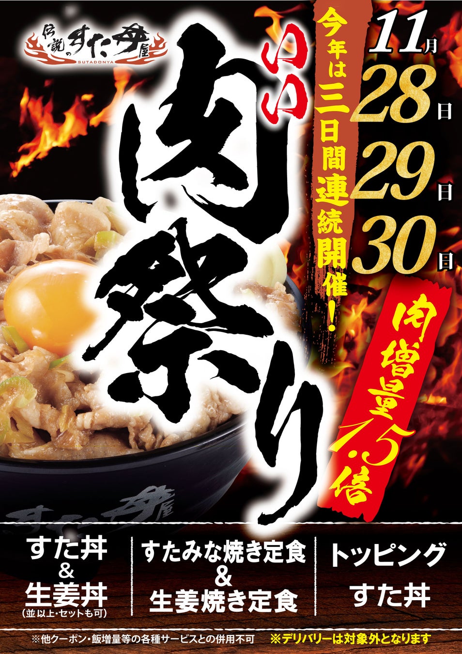 昨年の開催直後から、毎年開催して欲しいとのご要望を多くいただいたため、2年連続での「いい肉祭り」の開催を決定いたしました。今年は3年ぶりの行動制限のない夏休みをはじめ、多くの方が旅行やイベントを楽しまれたかと思います。今年もあとわずかですが、クリスマスなど多くのイベントが開催されるかと思います。そこで今年は昨年以上に忙しくなる皆さまを応援するため、28日・29日・30日の3日間連続で『肉の日キャンペーン』を実施することを決定いたしました。当店の『肉の日キャンペーン』では史上初の3日間連続開催となります。この機会にこれでもかというほど、秘伝のニンニク醤油ダレのパンチが効いたすた丼屋のお肉を存分にご堪能いただき、すたみなをつけて年末に向けて走り抜けましょう!