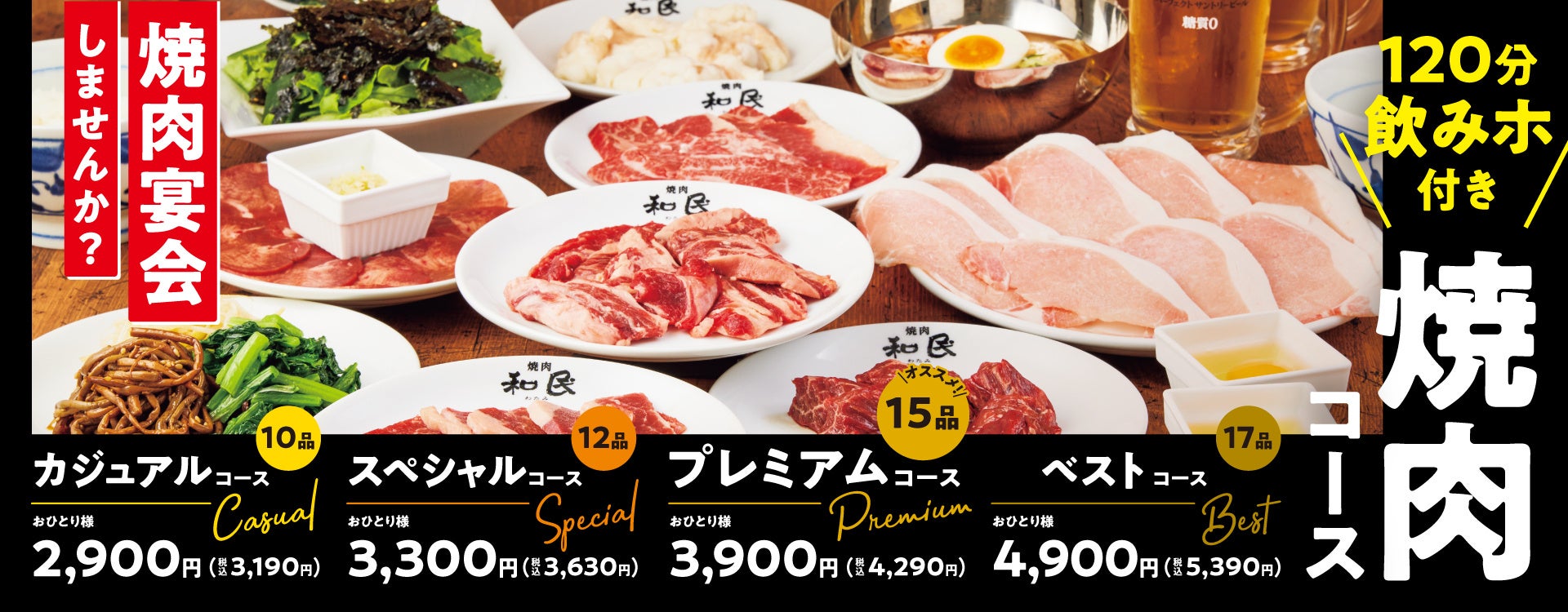 そんな「焼肉の和民」は3年振りに制限のない年末を迎えるにあたって、120分のドリンク飲み放題付きのおひとり様2,900円(税込3,190円)の「カジュアルコース」、3,300円(税込3,630円)の「スペシャルコース」、3,900円(税込4,290円)の「プレミアムコース」、4,900円(税込5,390円)の「ベストコース」の4種をご用意いたしました。