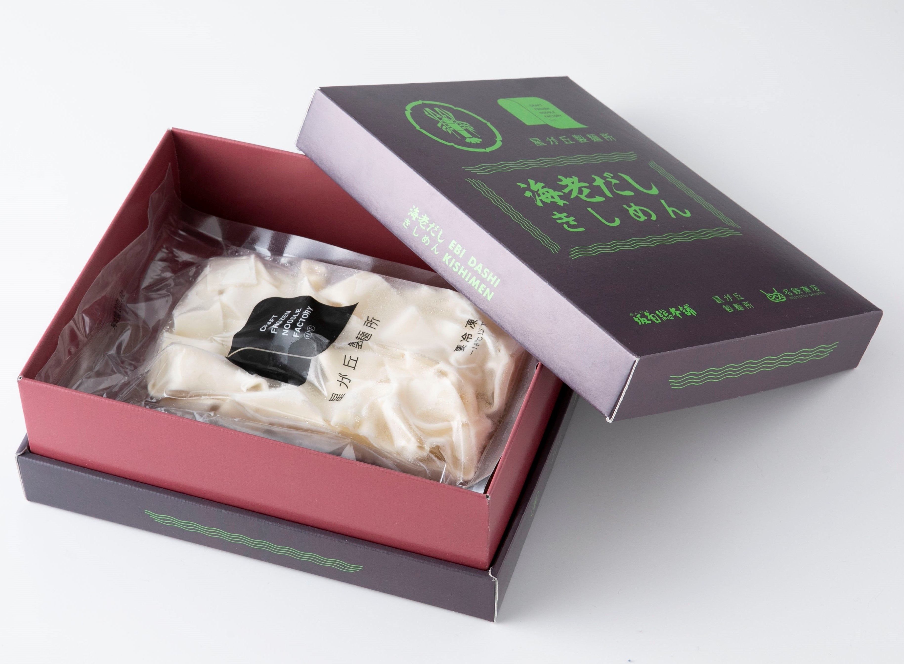 冷凍きしめんと冷凍つゆを各2食分と、海老せんべい〈ゆかり〉2枚がセットになっており、打ち立てのような弾力のもっちりとしたきしめんを、旨み深い海老だしの効いたつゆとともに、ご自宅でお気軽にお楽しみいただけます。