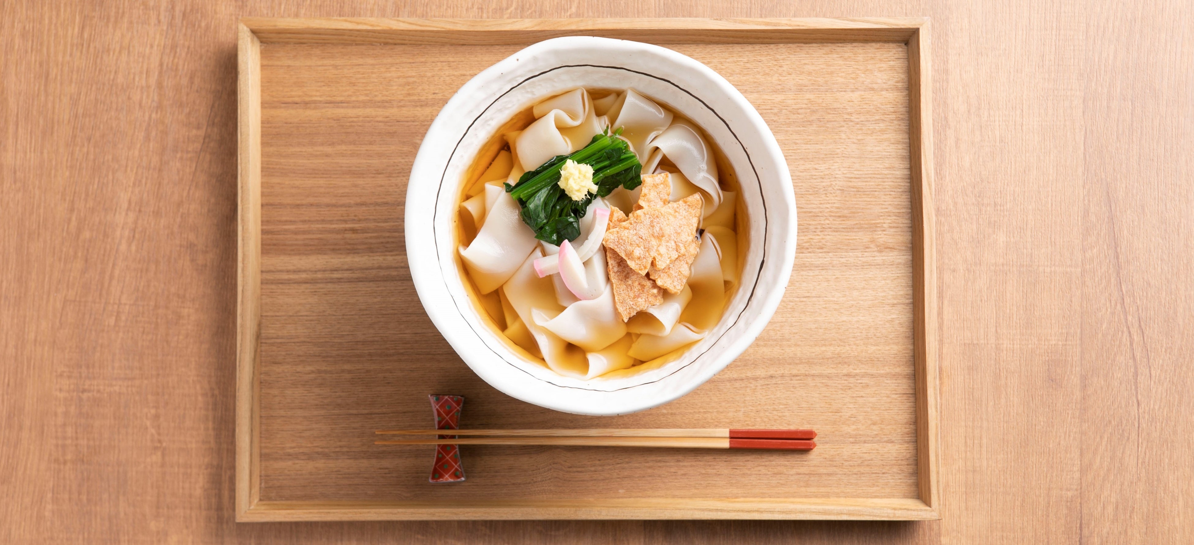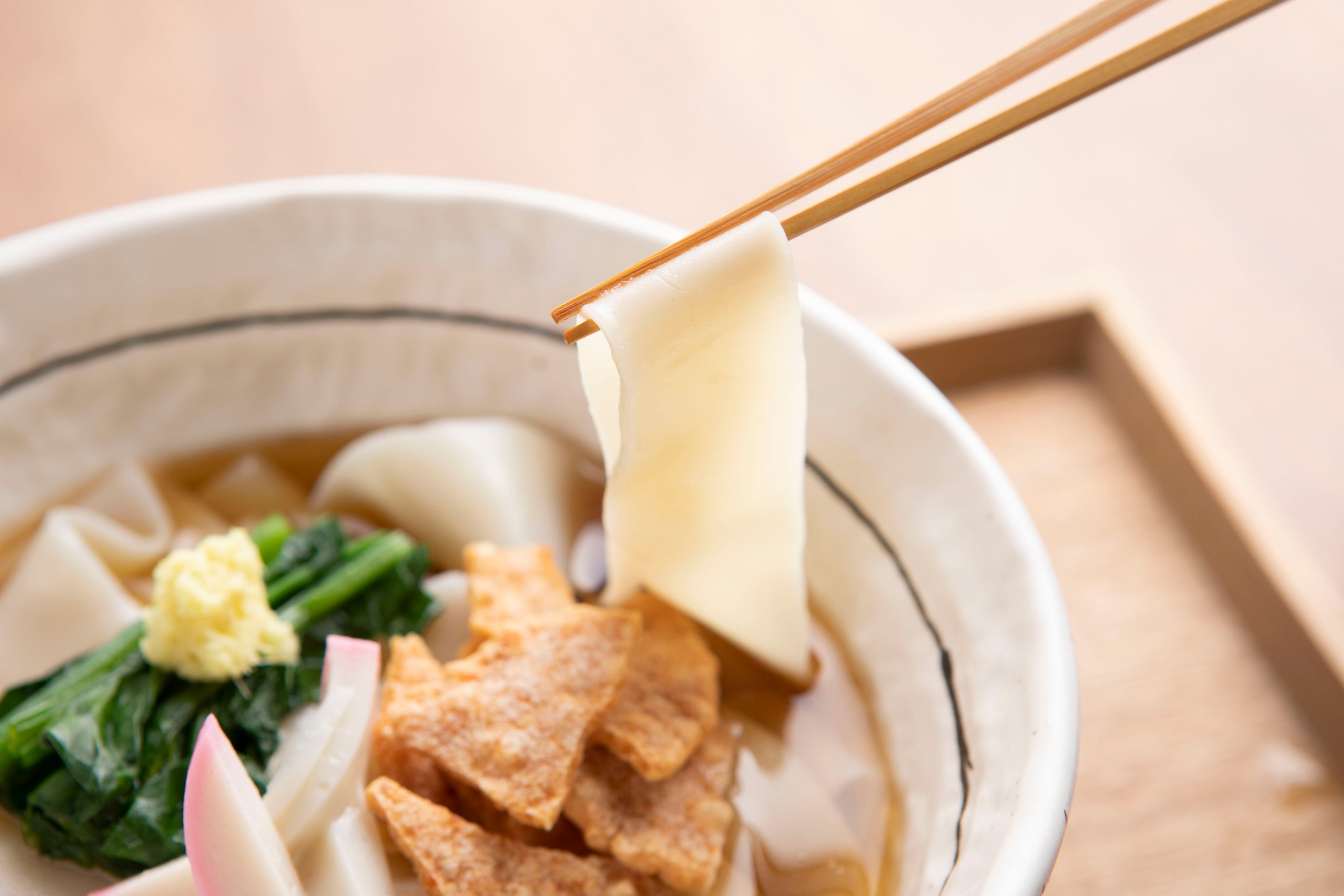 星が丘製麺所のきしめんは麺料理向けに愛知県で品種改良を重ねて開発され愛知県内で栽培された小麦「きぬあかり」で作ります。麺を薄く延ばしても切れず、もっちりとした食感が特徴です。