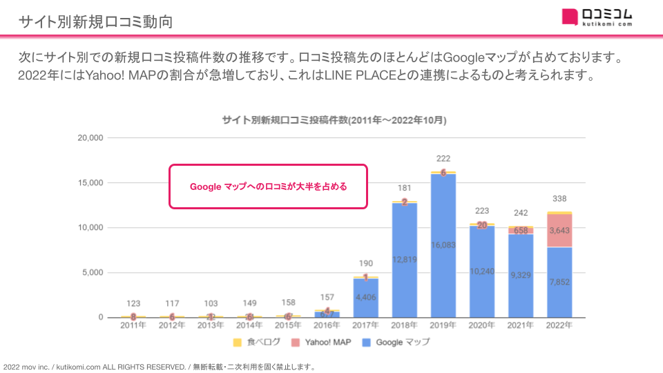 次にサイト別での新規口コミ投稿件数の推移です。口コミ投稿先のほとんどはGoogleマップが占めております。2022年にはYahoo! MAPの割合が急増しており、これはLINE PLACEとの連携によるものと考えられます。