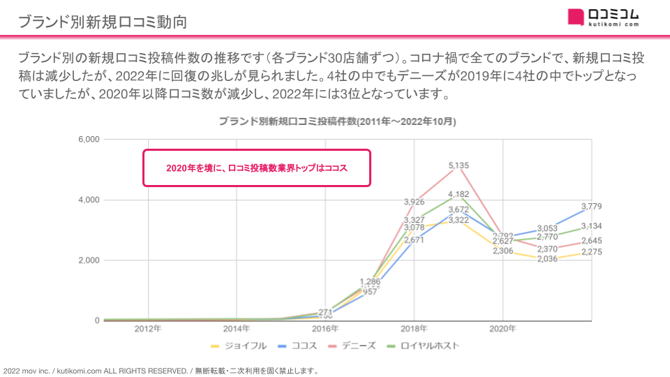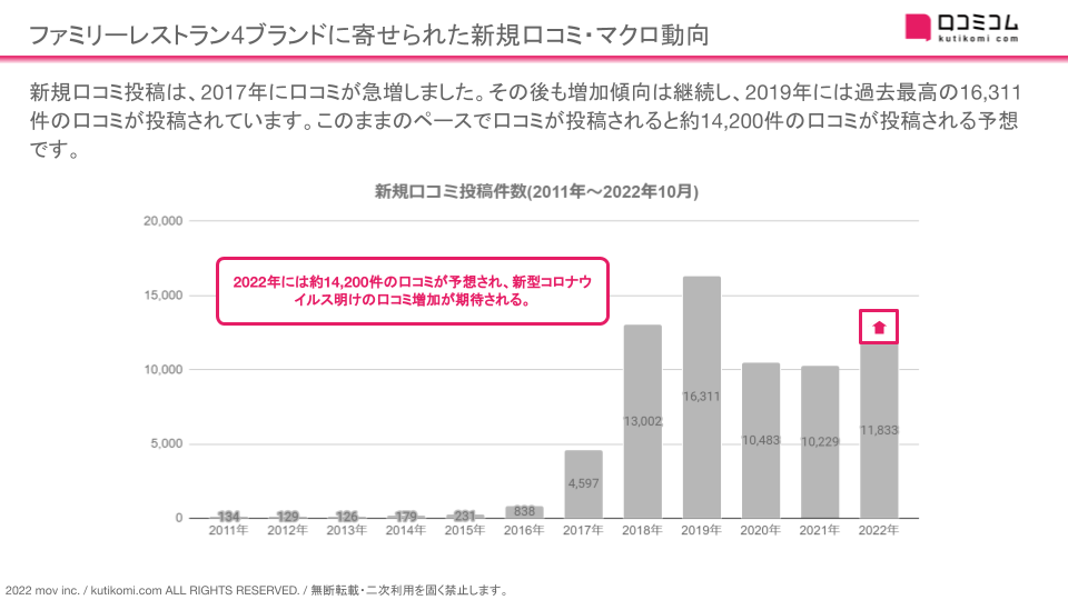 ・ファミリーレストラン4ブランドの口コミ件数増加の兆しが2022年から見られること