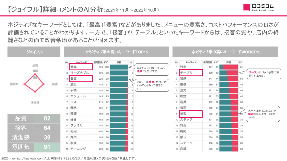 それらのAI解析を用いた分析例として「ジョイフル」のQSCA・頻出ポジネガキーワードを確認しました。