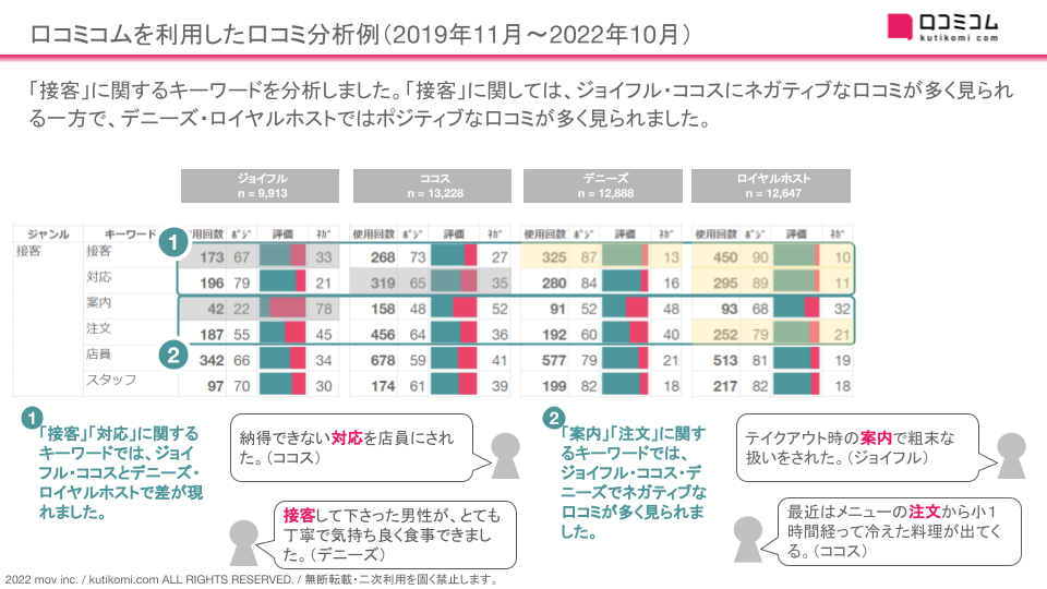 ・「接客」面でポジティブな口コミが集まるデニーズ・ロイヤルホストとネガティブな口コミが見られるジョイフル・ココスという2グループで差があること