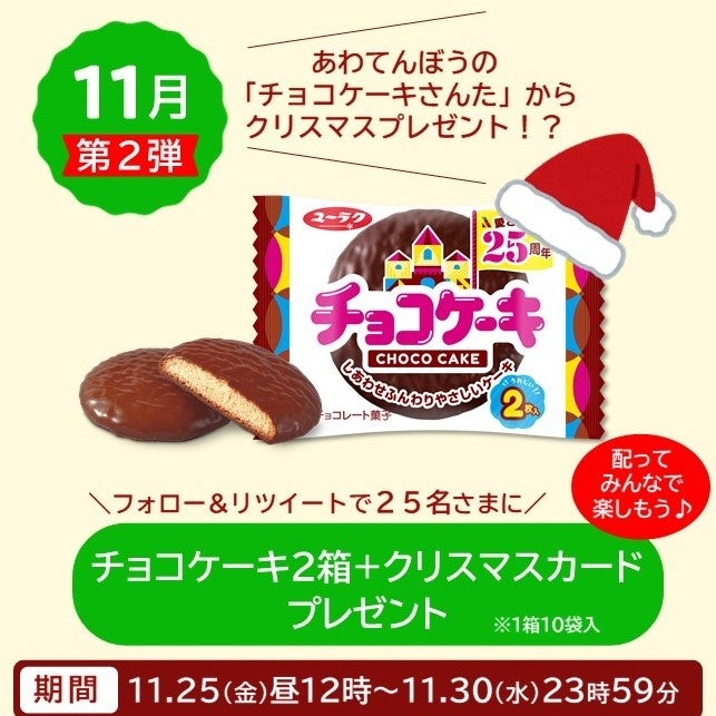 (URL: https://twitter.com/ChocoCake_San)をフォローし、指定のツイートをリツイートすると、抽選で25名様に「チョコケーキ」2箱(1箱10袋入)とクリスマスカードをプレゼントいたします。