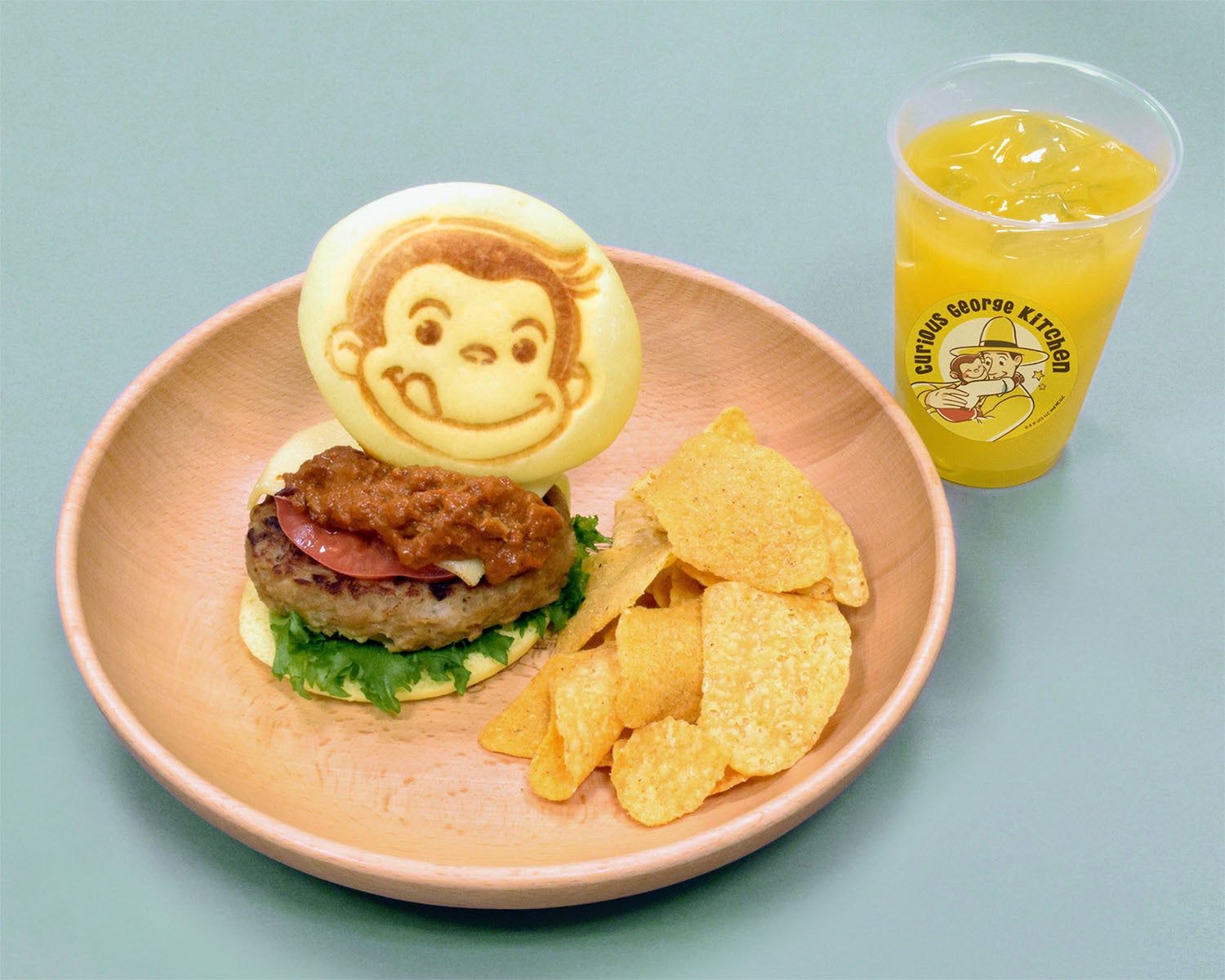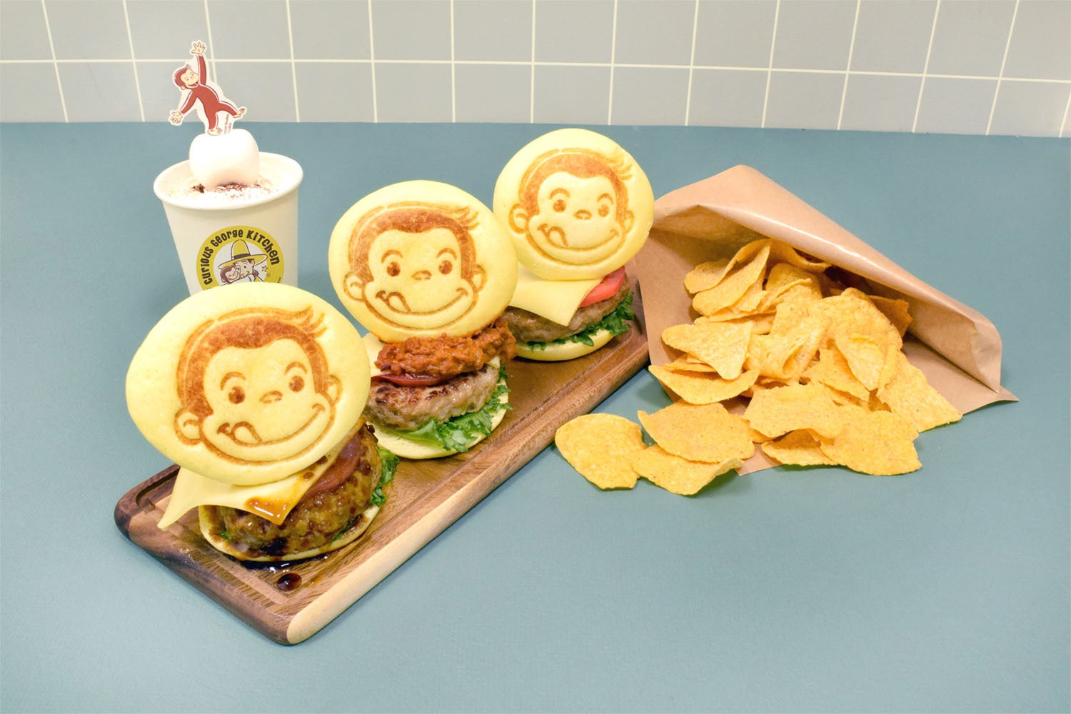 カフェ開催時に大好評を博した人気メニューのひとつ、ふわふわもっちりの生地が特長の、ジョージのおかおのオリジナルバンズを使用したハンバーガーがさらにパワーアップ!バリエーション豊かな3つの味で登場いたします。